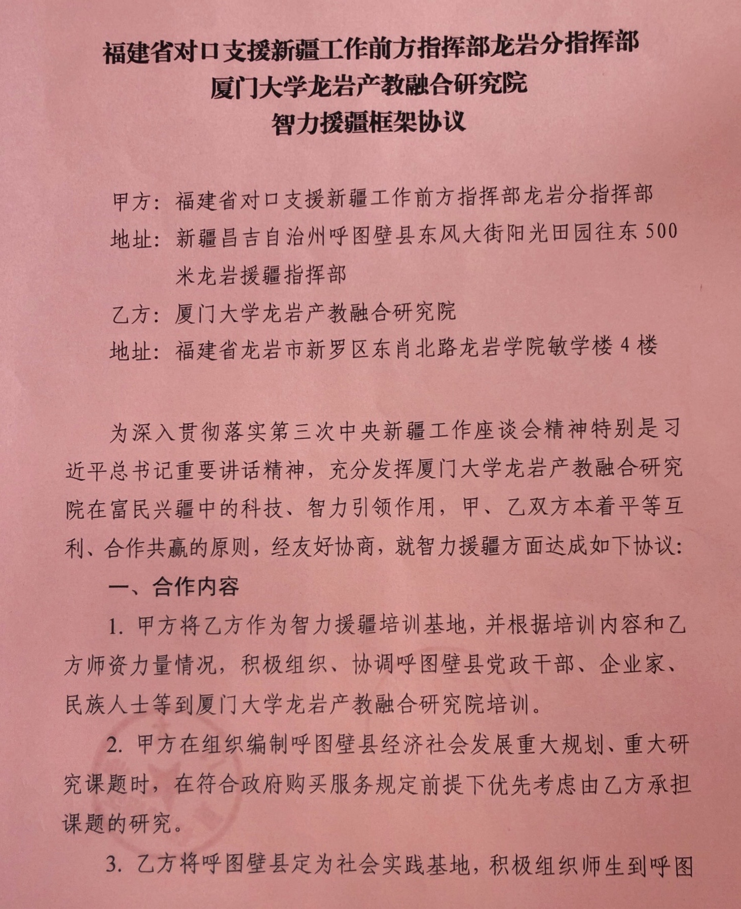 为深入贯彻落实第三次中央新疆座谈会精神特别是习近平总书记重要讲话精神,充分发挥福建高等院校在文化润疆、富民兴疆等方面的作用,我院积极贯彻落实龙岩市委市政府相关指示,与福建援疆龙岩分指挥部签订了智力援疆框架协议。