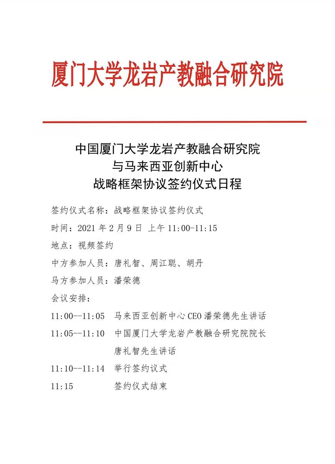 2月9日上午,厦门大学龙岩产教融合研究院与马来西亚创新中心通过云方式签订战略协作框架协议。马来西亚创新中心是马来西亚高等教育部直属公益性机构,主要代表马来西亚与其他国家和地区开展产学研合作、科技成果转化、技术引进和企业技术对接等业务活动,已经与马来西亚国内许多高校和企业建立了长期紧密的联系。研究院出席人员有唐礼智院长、周江聪副院长、综合文员胡丹、连晓星等,马方出席人员有马来西亚创新中心主席王惠生、CEO潘荣德先生等。签约仪式由周江聪副院长主持,潘荣德先生、唐礼智院长分别代表所在机构致辞并签约,王惠生主席等见证签约。