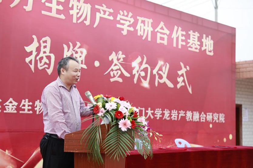 2020年10月30日上午,厦门大学龙岩产教融合研究院与福建福迩金生物科技有限公司、厦门大学长江学者和杰青谢素原教授团队共建的“南方生物产学研合作基地”揭牌暨项目签约仪式隆重举行。厦门大学化工化学院谢素原教授、厦门大学龙岩产教融合研究院院长唐礼智教授、福建福迩金生物科技有限公司董事长谢福发参加此次活动,时任漳平市市长胡滨等相关领导以及龙岩市科技局成果转化与对外合作科科长池国祯莅临指导。在此次签约仪式上,唐礼智院长、谢素原教授团队与福建福迩金生物科技有限公司分别签订了“共建南方生物产学研合作基地”合作协议、“α-生育酚的定量催化转化”项目协议。其中α-生育酚的定量催化转化技术不仅可以填补国内空白,而且未来也有冲击国家、省级科技进步奖的可能性。