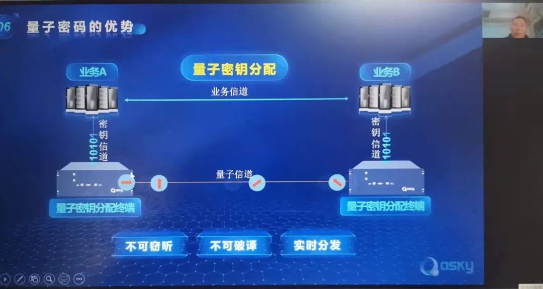 苗春华高级工程师作《量子密码产品与应用》报告,他从信息安全攻与防不断博弈的视角,从技术背景——技术应用——技术产品——应用场景四个层面阐述量子密码的技术手段、应对策略以及相关产品。目前,信息安全隐忧分为:一是窃听手段,包括终端、核心网络、传输线路;二是破译。解决方法可概括为以下公式:安全通信=安全加密技术+安全密钥分发技术+量子测不准原理+量子不可被复制原理+一次一密的密钥交换体系(密钥随机产生,明文、密钥和密文的长度一样)——窃听就会被发现。