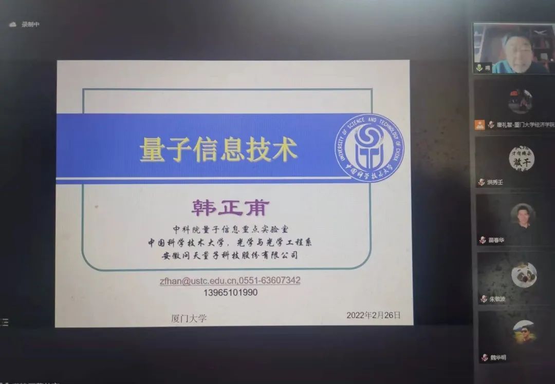 为了给量子信息领域的科研及产业人员提供一个学术交流平台,展现最新技术前沿,加快科技成果产业化,由厦门大学龙岩产教融合研究院、厦门大学智慧与绿色发展研究中心、问天燃阳量子(福州)科技有限公司联合主办的“量子信息科技与产业发展论坛”于2022年2月26日上午成功举办。由于疫情防控原因,本次会议通过线上方式举行,主办方特别邀请中国科学院量子信息重点实验室主要缔造者之一、中国科学技术大学韩正甫教授,安徽省战略性创新技术领军人才苗春华高级工程师、安徽问天量子科技股份有限公司总裁助理李大伟先生分享了量子信息技术研发现状和产业化应用,共同探讨从“科学”到“应用”到“产业”的发展之路。会议由厦门大学国内合作办公室副主任、龙岩产教融合研究院院长唐礼智教授主持,问天燃阳量子(福州)科技有限公司总经理魏华明先生做总结发言,来自科研院校、知名企业、地方政府等社会各界近60人全程参加了本次会议。