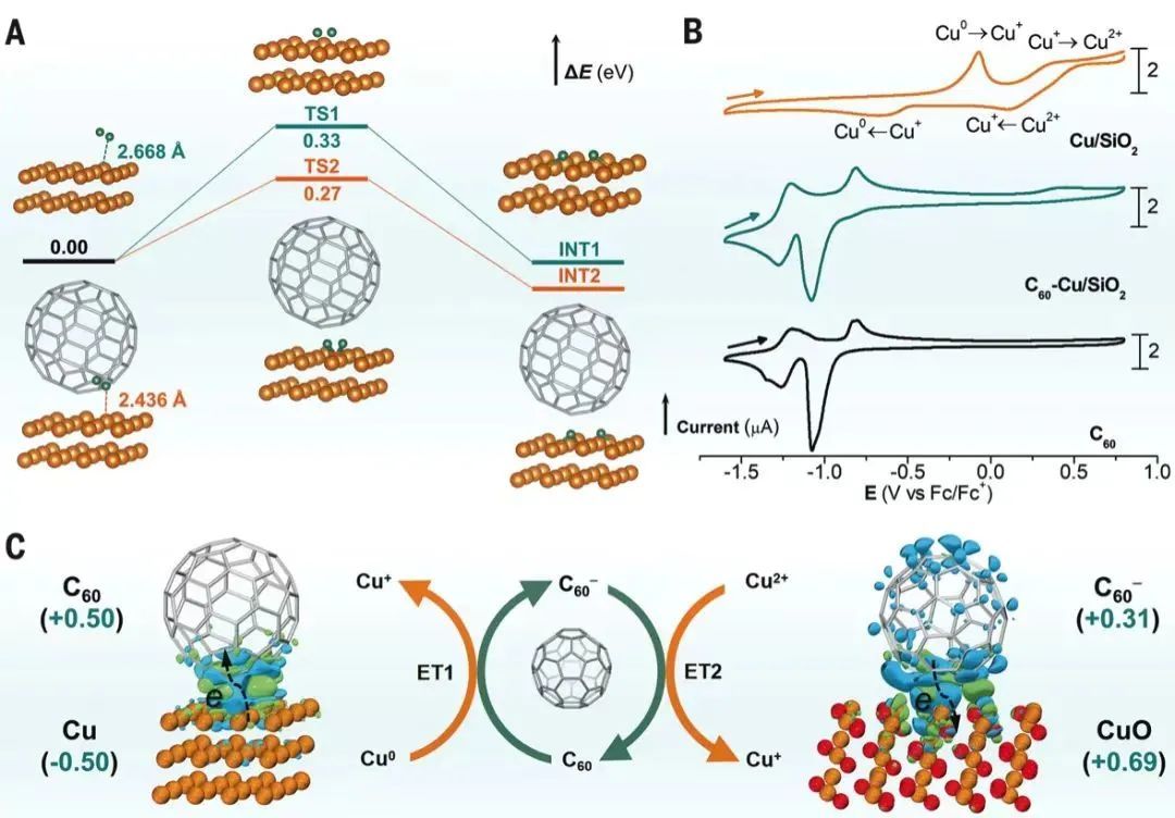 富勒烯作为电子受体(抑或电子供体)与过渡金属催化剂结合并非全新课题,但将富勒烯作为电子缓冲剂与过渡金属催化剂结合,尚属首次。“该技术核心在于将C60与铜催化剂结合,实现了草酸二甲酯加氢制乙二醇从高压到常压的颠覆性催化性能提升,给碳团簇催化注入了新的生机。”谢素原院士介绍。