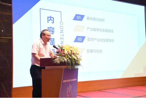 在游诚志董事长作为主办方致辞以及27个海峡两岸数字产业项目现场签约之后,随即进入专家演讲阶段。研究院院长唐礼智教授应邀作“数字经济产业发展路径”的主题演讲。唐礼智教授首先从数字经济内涵出发,指出随着数字经济的不断发展,数字经济已经由最初的“两化”(数字产业化、产业数字化)至“三化”(数字产业化、产业数字化、数字化治理),再到现在的“四化”(数字产业化、产业数字化、数字化治理、数据价值化)。在上述框架下,提出数字经济上游产业链,主要围绕基础设施等底层架构展开;数字经济中游产业链,主要围绕数字产业化展开;数字经济下游产业链,主要围绕产业数字化展开。进而,从技术、应用场景、案例等方面详细剖析了产业数字化如何转型发展、数字产业化集群如何打造等一系列关键性问题。对地方政府来说,数字经济不是数字“四化”的简单叠加、也不是各部分孤立发展,而是根据各自的特点,选择主导方向,带动其他内容协同发展。