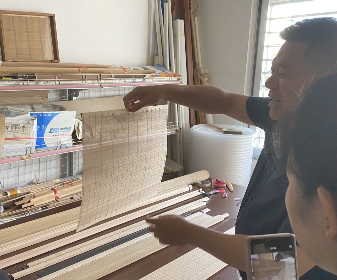 7月22日,实践队来到了龙岩市新罗区的浮竹岭纸簾生产作坊参观考察。纸簾以细竹条编成,用于手工抄纸,纸簾的优劣与制成纸张的质量密切相关,故而纸簾生产是一项细致且复杂的活计。作坊主池沧海老家位于龙岩万安镇,据称其祖先在清朝中叶从外地人翁仁岩手中学到了纸簾的生产工艺,并一直传承至今,已有几百年的时间。他对纸簾的一些工艺进行了适当的改进,以使纸簾簾面平整、缝隙均匀、竹丝圆润,成为手工纸生产的必备精品。其纸簾不仅在国内销售,还远销海外日、韩等国。