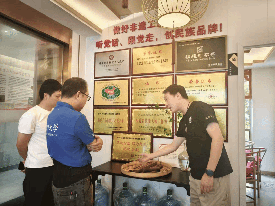 随后,卢常德先生还带领研究院团队参观了位于古田的万应茶体验馆。古田是龙岩著名的红色旅游胜地,享有“中国红色摇篮”之美誉。作为龙岩的特色产品,研究院与相关方就万应茶如何结合古田红色文化宣传发挥独特作用进行了深入探讨。黄凌风院长建议,应推动万应茶与当地红色旅游深度融合,开发兼具龙岩与古田特色的系列产品,面向游客推广。同时,可将万应茶纳入体验环节,让游客在品茶之余,进一步了解古田的红色历史。此外,企业还应积极参与红色文化节等活动,通过产品展示和现场制作演示,增强红色文化的互动体验与传播效果。这种将非遗产品与红色文化相结合的方式,不仅有助于提升万应茶的品牌价值,也能为古田的红色宣传注入新活力。
