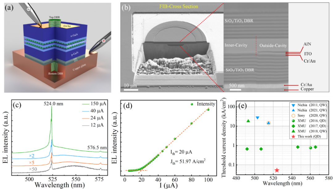 电注入GaN基VCSEL的 (a)结构示意图(b)FIB-SEM图(c)电注入EL光谱(d)PI曲线; (e)国内外GaN基绿光VCSEL阈值电流密度与波长的对应关系图